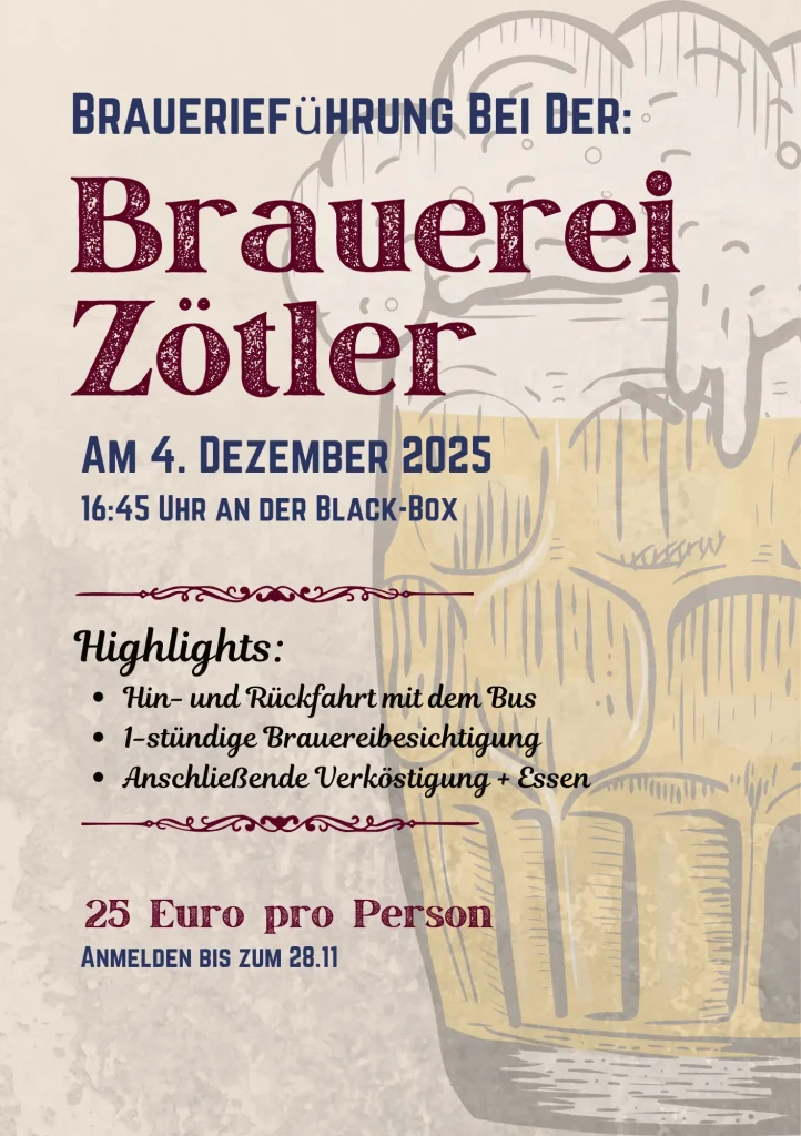 Es ist mal wieder Zeit für unsere all-semesterliche Brauereibesichtigung im Hause Zötler! Nach einer Tour durch die Brauerei erwartet euch ein einstündiger Gratisverzehr der Zötler-Produkte. Obwohl sieben Bier auch ein Schnitzel sind gibt es trotzdem eine kleine Brotzeit (Leberkäs mit Breze oder vegetarische Brotzeit) von uns, damit auch der Hunger nicht auf der Strecke bleibt. Für die Strecke hin und zurück haben wir einen Bus organisiert.